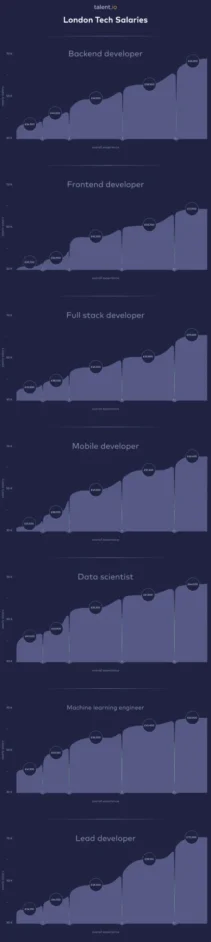 The infographic below details average salary expectations for web developers (Backend, Frontend, Full Stack), mobile developers, data scientists, and machine learning engineers in London.