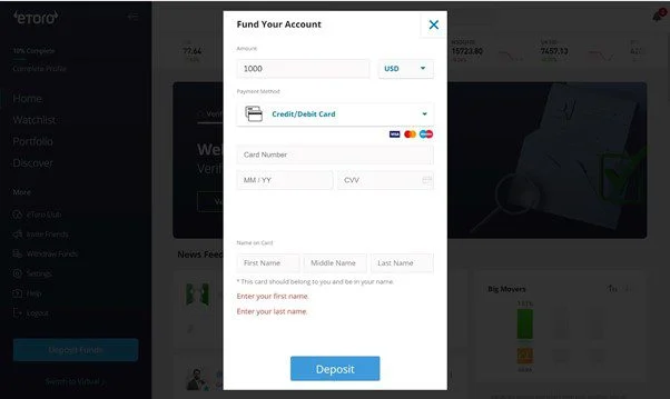 - Step 2: Deposit: eToro allows you to deposit using payment processors, cards, and bank transfers. Choose which works best for you.